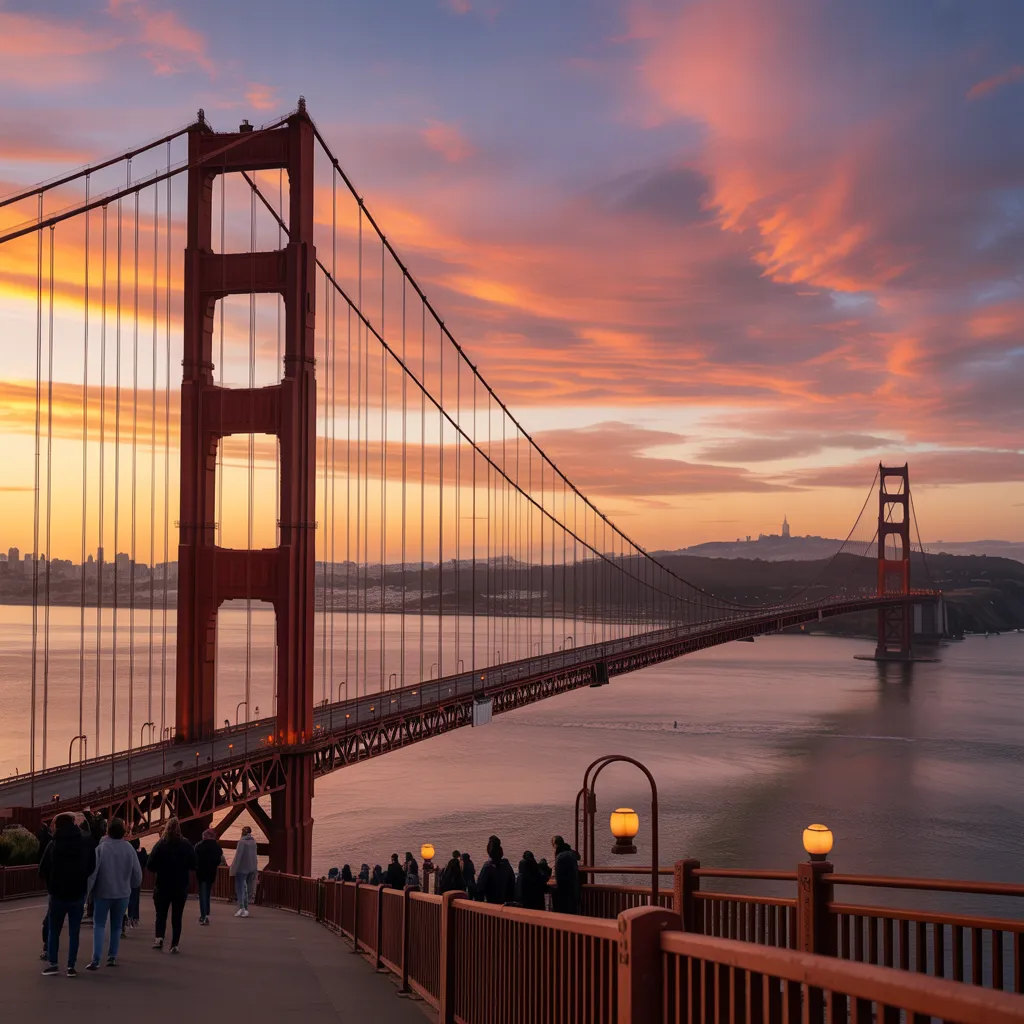 Tourists frequently take stunning photographs at different viewpoints, each offering a different perspective of the bridge's impressive towers and sweeping cables. The surrounding Golden Gate National Park presents opportunities for further exploration, with trails taking visitors to scenic overlooks. As the sun sets, the bridge transforms under the warm glow of twilight, making it a perfect spot for both reflection and adventure. The Golden Gate Bridge remains an unforgettable experience for all who venture to San Francisco.